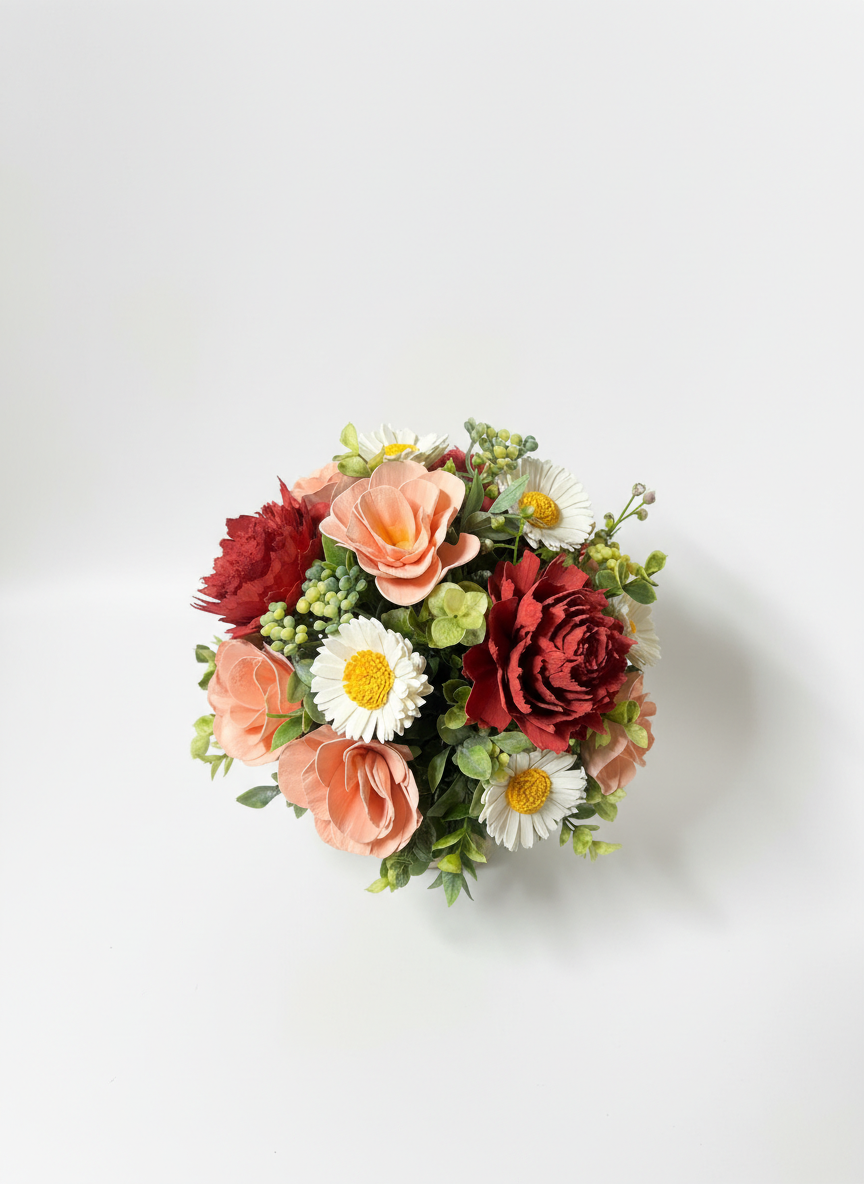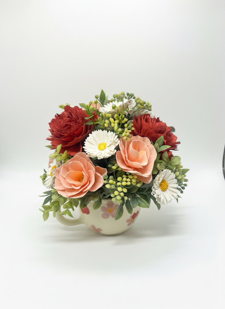 A beautifully crafted floral arrangement in a cute mug with a floral and cherry design. This arrangement will bring the fun and cheer to any table!