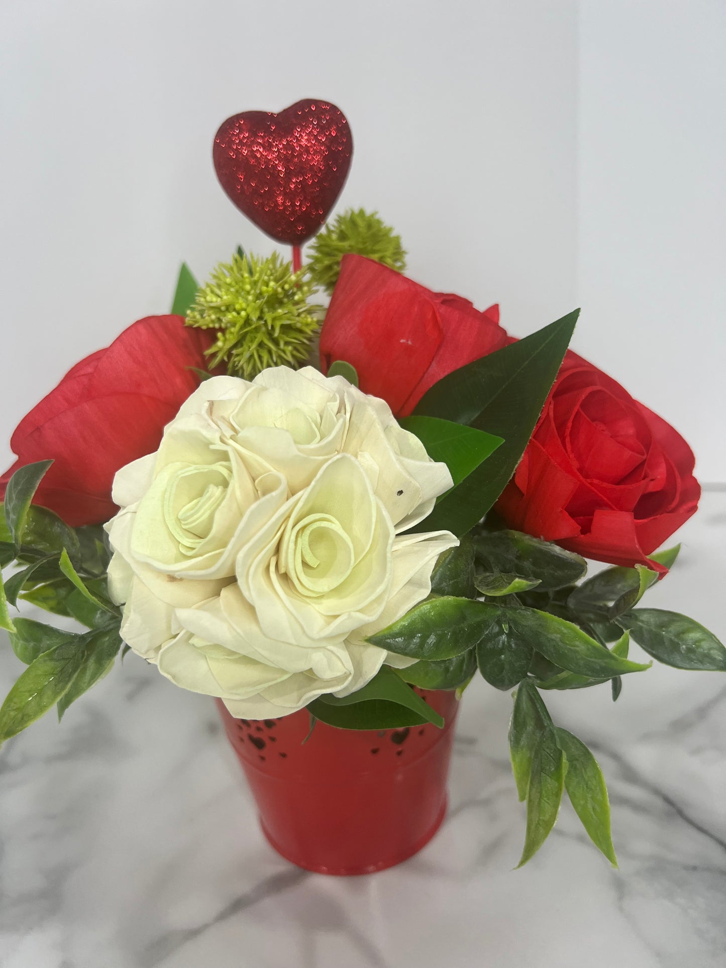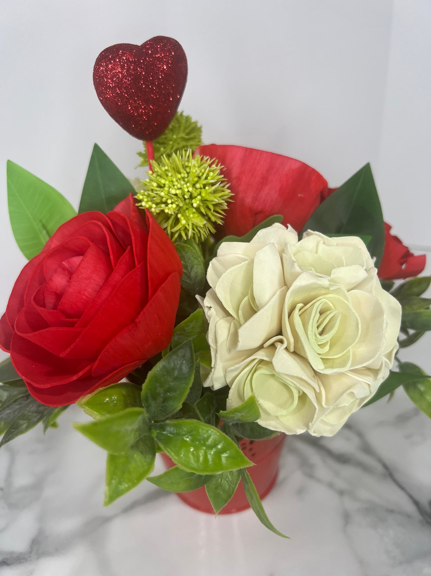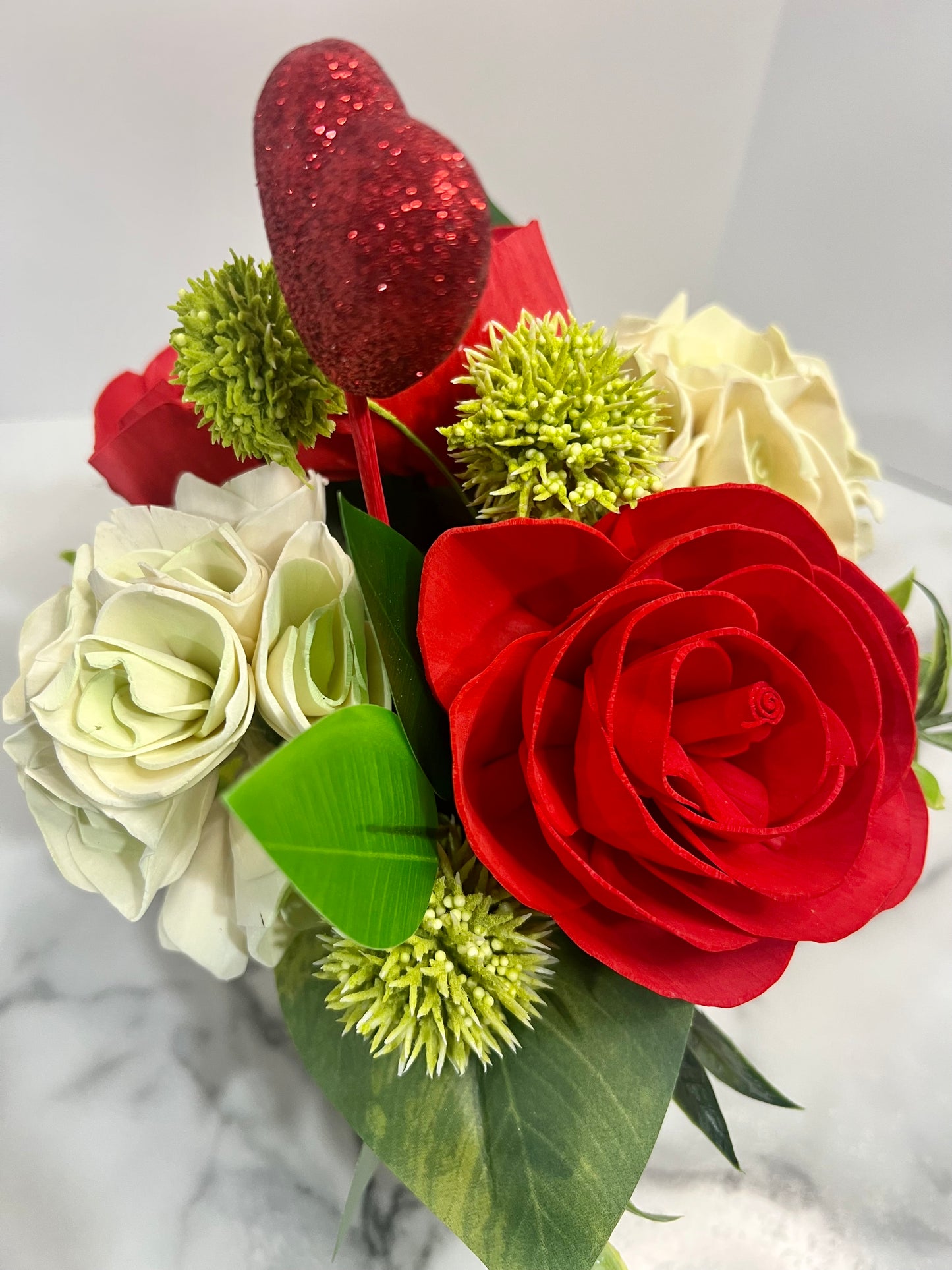 Beautiful, airbrushed hydrangeas and red, red roses make up this vibrant arrangement!