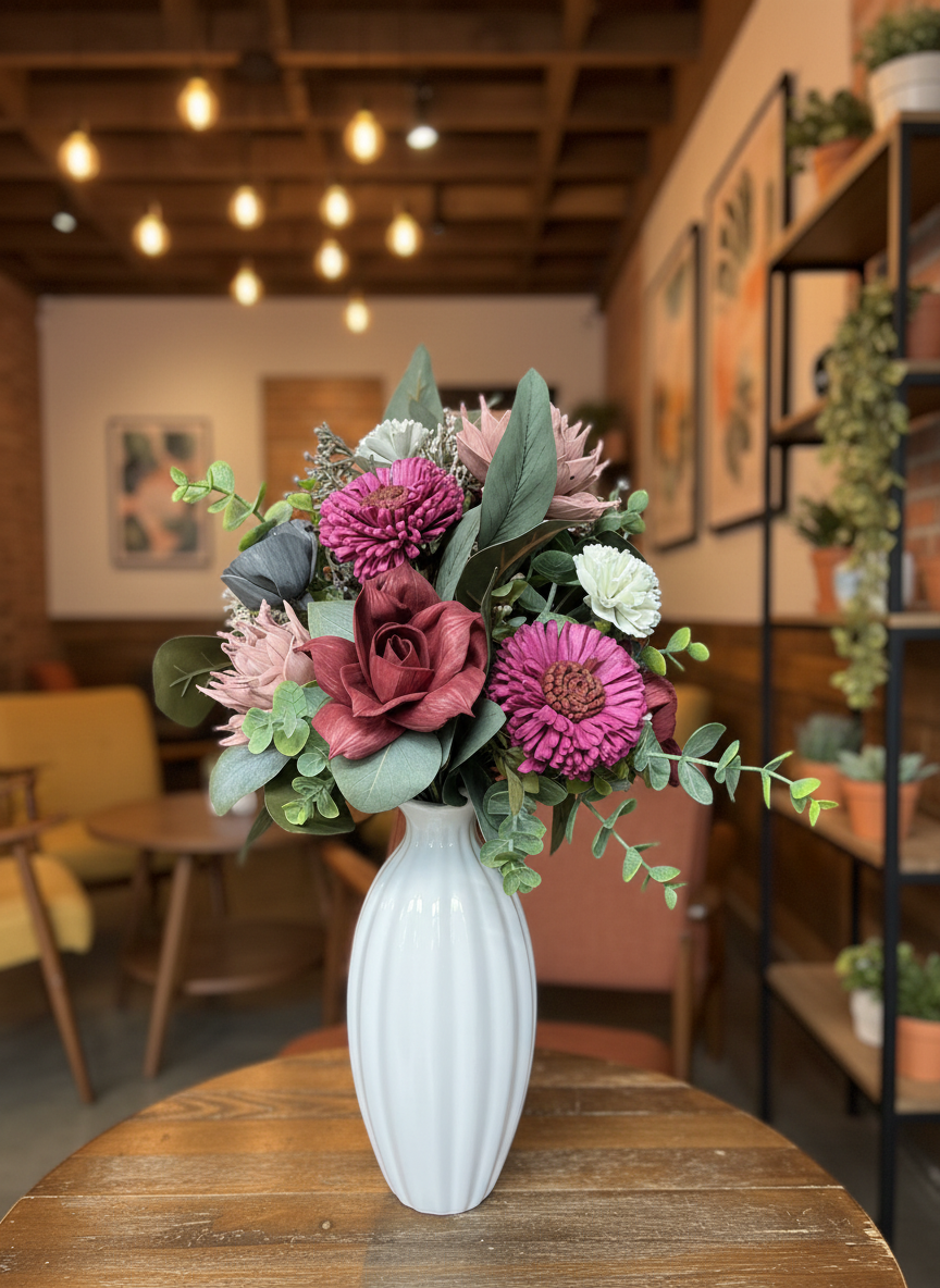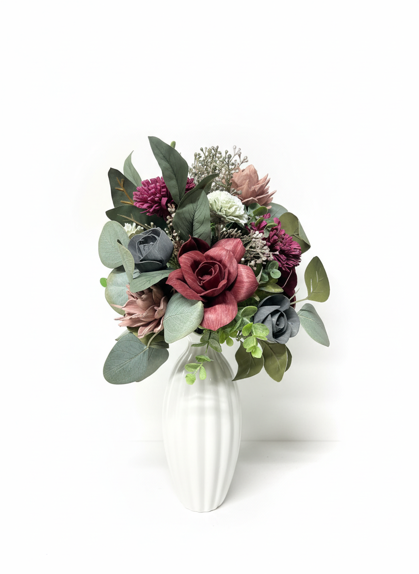 A mix of mulberry, mauve and eggplant flowers, with pops of understated gray and subtle blue accents.